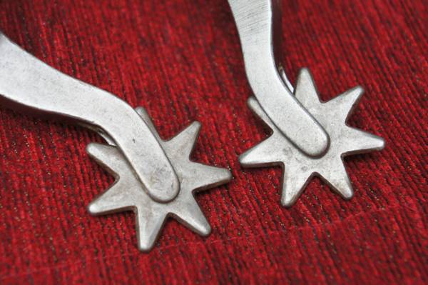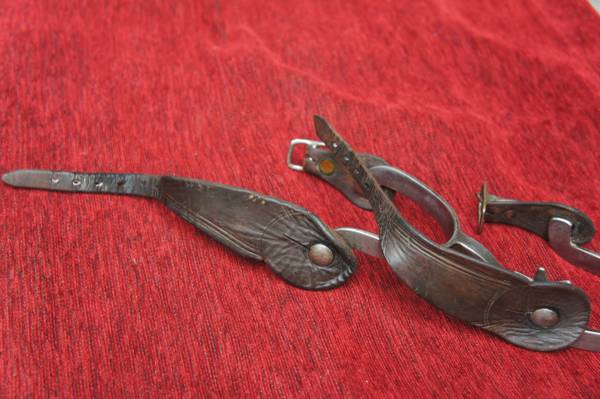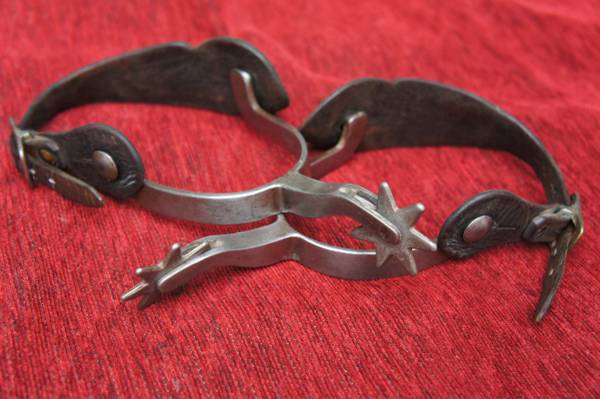 An antique pair of Crockett western spurs. They are made of steel. Each rowel has seven points. The lightly tooled leather straps appear to be original to the spurs. Original patina/use marks present, but overall these are in excellent antique/vintage condition. I see no functional damage.