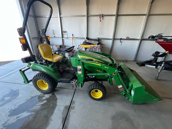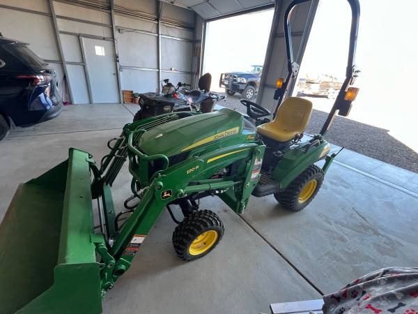 2024 1023E John Deere tractor! Lightly used! 136 hours, tires in great condition, everything in great condition. Comes with front loader, rake, post hole digger and balance bucket for back. Plus comes with the quick disconnect accessary!