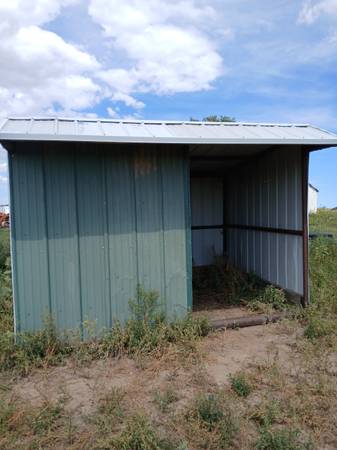 Portable pipe livestock shed made of 2 3/8 pipe with 4in pipe base. It measures 8ft wide by 11ft long and 6 ft and 6ft 9in tall in the rear, 7ft at the peak. It has a 6ft wide front opening by 7ft tall. Was used for horses. Asking $2800