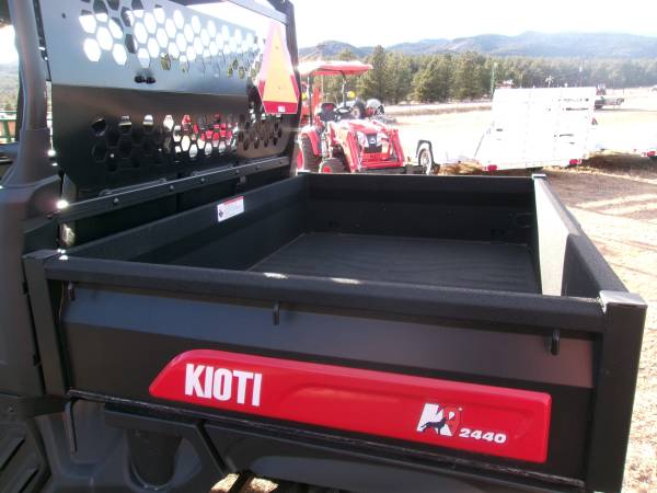 KIOTI Diesel K9 2440: 24HP Utility Vehicle by KIOTI, 3 Cylinder inline vertical diesel engine, hydraulic power steering, 4WD, differential lock, four-wheel hydraulic disk brakes, heavy duty tires with steel wheels, heavy duty grill guard, wide steel cargo bed with Rhino Lining, 1100# load capacity for bed (1598# payload), front and rear receiver hitch - 1300# towing capacity (rear), 12.5 inch ground clearance, manual rear bed dump, 2 front seats with head rests and middle console, rear bench seat with 3 seat belts, K9 weight = 2050#, 18 month KIOTI warranty.