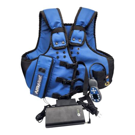 AffloVest is a mobile, high-frequency chest wall oscillation (HFCWO) device used for airway clearance therapy, particularly for individuals with respiratory conditions like bronchiectasis, cystic fibrosis, and neuromuscular diseases. It utilizes patented Direct Dynamic Oscillation™ technology with eight oscillating motors to mimic manual chest physiotherapy and help mobilize lung secretions. The device is designed to be portable and allow for greater patient mobility during therapy.