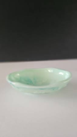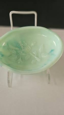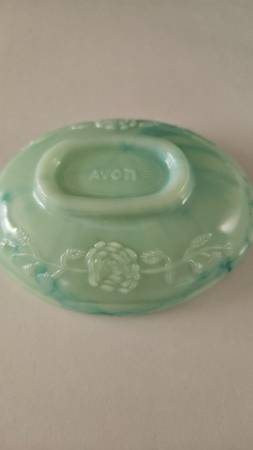 Vintage Avon soap dish, oval shape, 5" x 4" x1", swirled milk glass look, blue/green Perfect condition, has rose imprints on it. Marked Avon on the bottom. $4 Call