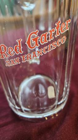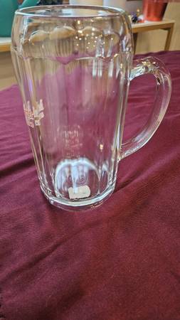 Large, heavy, fluted beer stein. Holds 36 oz. Bright red and white writing, in excellent condition. $7 Call