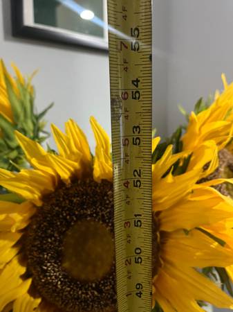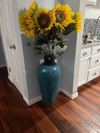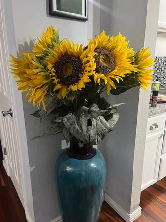 6 tall Crate and Barrel Sunflowers in tall turquoise urn. Originally each sunflower was $45. Sunflowers can be bent/adjusted to the shape/style you want. Perfect condition.