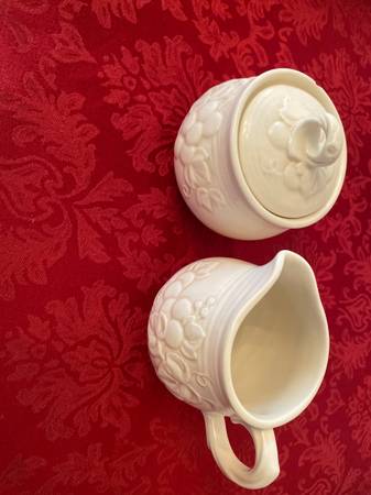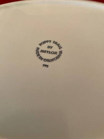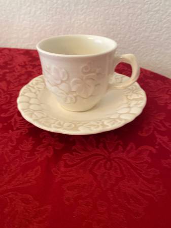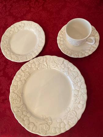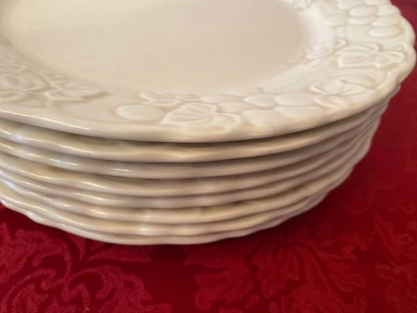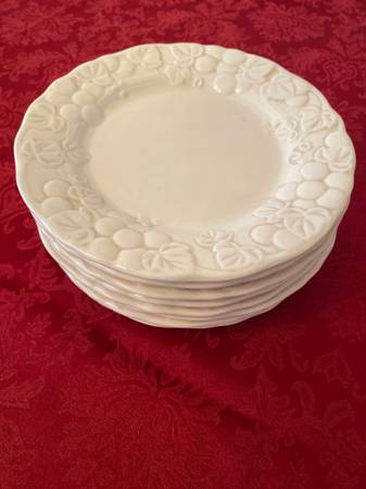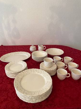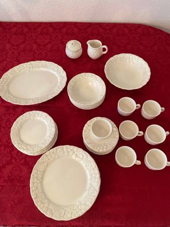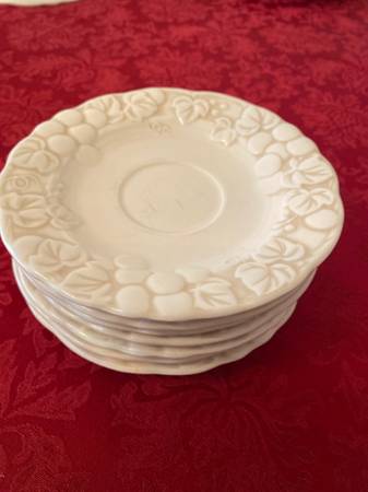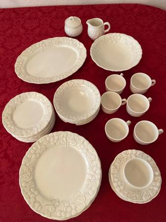 Vintage Vernon PoppyTrail embossed, fruit and berry rim cream colored Eight dinner plates, eight salad plates, eight saucers, six coffee cups, five soup/cereal, bowls, one large, serving platter,...