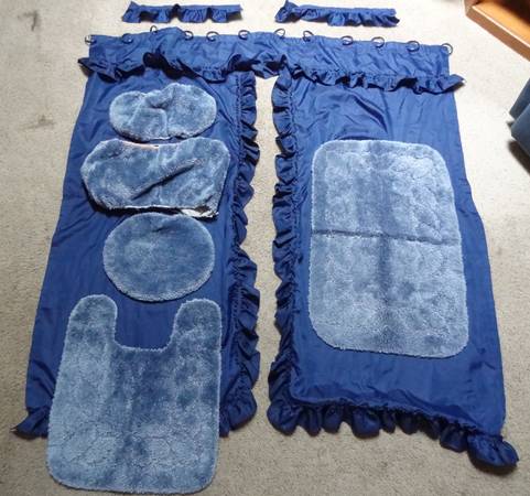 - 8-piece dark blue bathroom set includes a shower curtain with rings $4, a 4-piece toilet cover set $5, and a bath rug $3. These items are all in excellent condition. Asking $8 obo for the set.