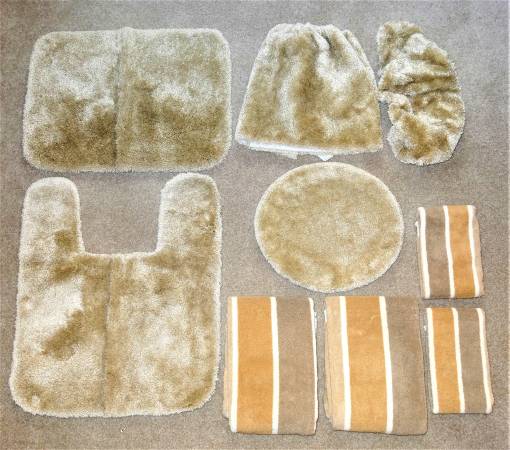 - 9-piece lite tan colored bathroom set includes a 4-piece toilet cover set $5, a bath rug $3, 2 large bath towels $2 ea., and 2 hand towels $1 ea. These items are all in excellent condition. Asking $10 obo for the set.