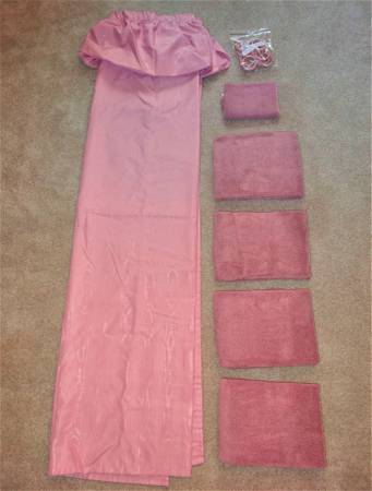- 6-piece Mauve colored bathroom set includes a shower curtain with rings $4, 4 large bath towels $2 ea., and a hand towel $1. These items are all in excellent condition. Asking $10 obo for the set.