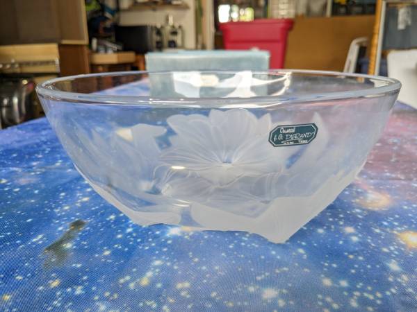 Beautiful Cristal J.G. Durand France ROMANCE 3-Footed Fruit Bowl, featuring frosted etched Flowers in high relief on the low part of exterior. On the bottom exterior, the convex flower core acts as foot - what a unique & brilliant design! The inside of the bowl is smooth, making it easy to clean.