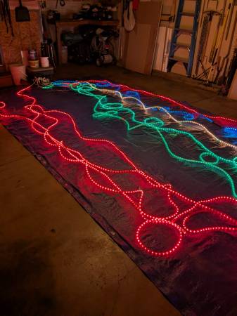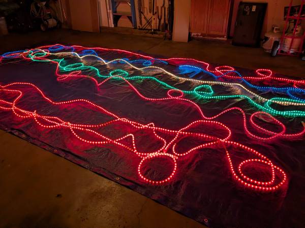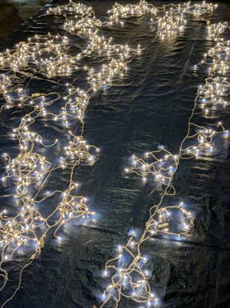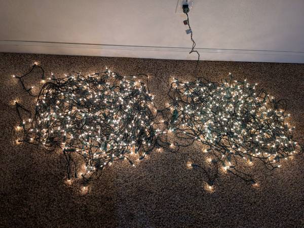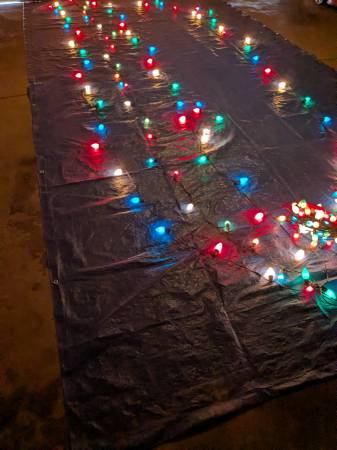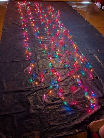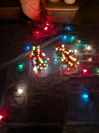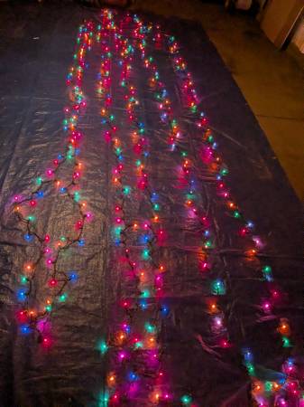 Christmas rope lights 180 ln feet Light bulb lights (red, white, blue, green, and orange) 200 ln feet Green cord color lights 70 ln feet Green cord icicle lights 72 ln feet White cord icicle lights...