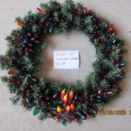24" Christmas Wreath, artificial Green Pine, florist quality, w/Glass C7 bulbs, handmade c.2023, does not light, indoor-outdoor in protected outdoor space