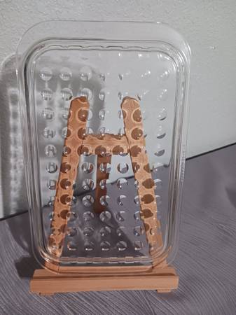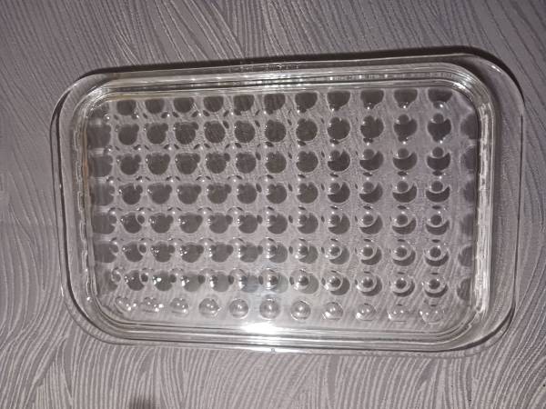 The Pyrex MC-2-0 Heavy Glass Lid for a large rectangular casserole dish, often referred to as a "bubble dot" or "optic dimple" lid. It is a vintage piece, designed to fit a Pyrex or CorningWare rectangular dish that is approximately 12" x 7". Has a few small scratches but not unusual for its age.