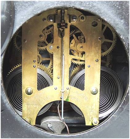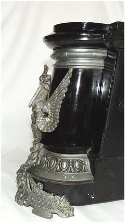 An American Ansonia Pompeii Mantle Clock, Circa 1880-1900. Japanned Iron with Pewter Mounts. Ansonia Clock CO, New York NY. The mantle clock tiled 'Pompeii', the model having an iron case with 8-day time and strike movement and two part enameled face dial with Roman numerals. Come with original weight and key. The Japanned iron case with pewter finished mounts. Made with high-quality craftsmanship.