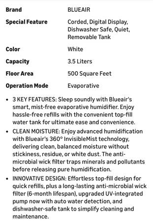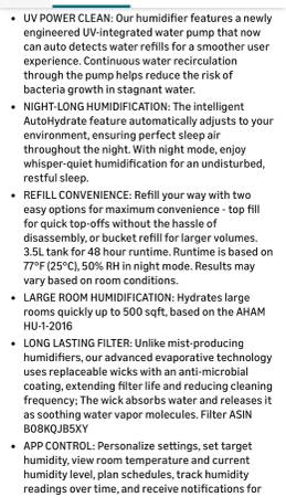 The pictures say it all! Recommended by Wirecutter as best humidifier for 2025. Please refer to the images for the details. Two are available used just a few months last season and well maintained.