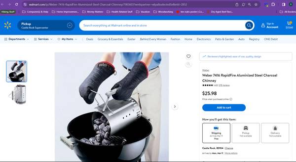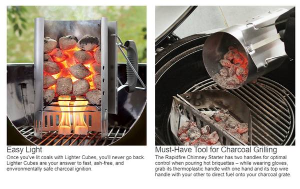 Manufacturer description: Get your fire burning quick with the must-have tool for all charcoal grillers. The durable, aluminized steel Rapidfire Chimney Starter has two handles to provide optimal control when pouring hot briquettes (wearing gloves), just grab its thermoplastic handle with one hand and its top wire handle with your other hand to direct fuel onto your charcoal grate. Its cylindrical canister holds enough charcoal to fill your kettle, and its cone-shaped bottom ensures that briquettes light quickly and evenly. To use your Rapidfire Chimney Starter, simply place it over a lighter cube or crumpled newspaper, light your preferred fire starter, and you’re well on your way to burning red-hot briquettes—in less time and completely lighter fluid free.