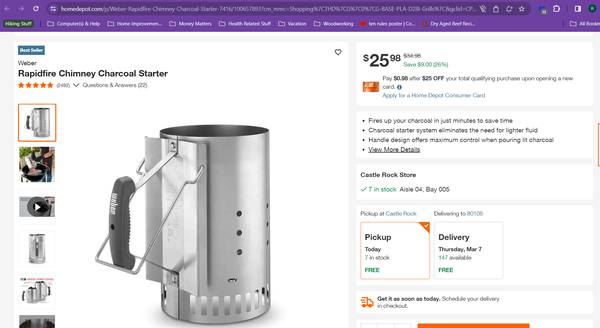 Offering a used Weber brand Rapidfire Chimney Starter in good condition. If you've never used one of these it's a game-changer for BBQ-Time.