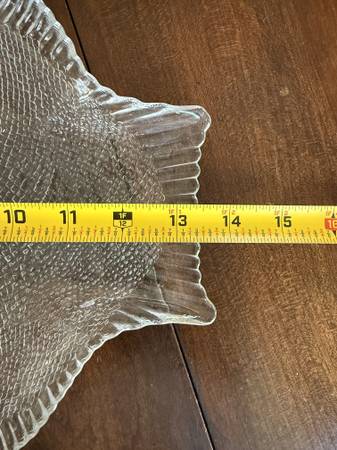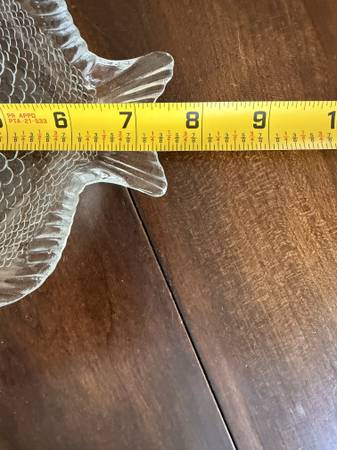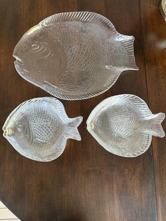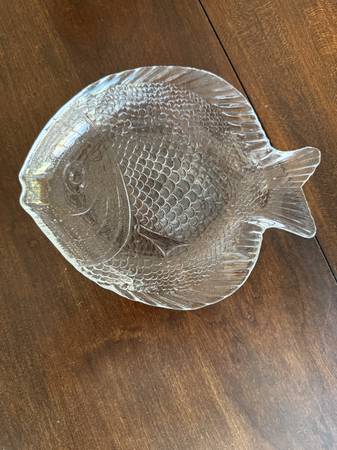 The cutest glass, fish serving platter with 8 smaller fish plates. Perfect condition, no chips or cracks. Fish platter approximately 13 3/8 inches long Fish plates approximately 7 1/4 inches long...