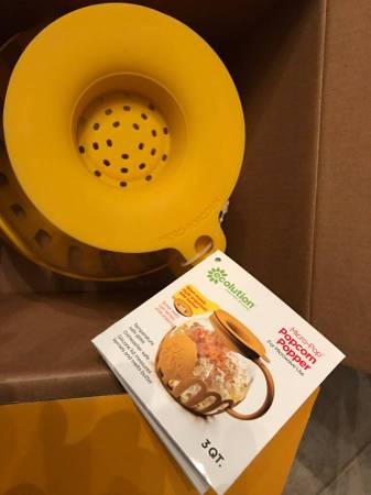 Microwave glass popcorn popper, 3 qt, yellow, $8. Brand new! Tags still on it. Please do not respond by y a h o o mail or 'paste in link' or a o l as we did some testing and it appears they don't...