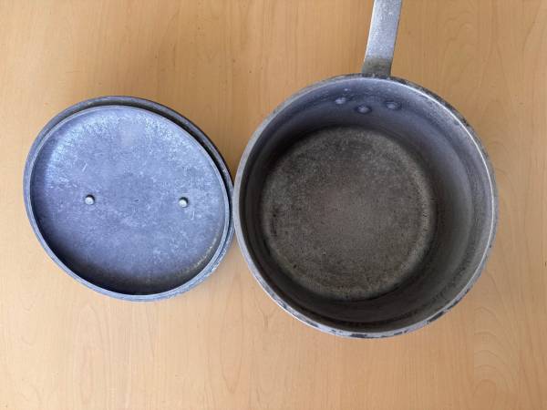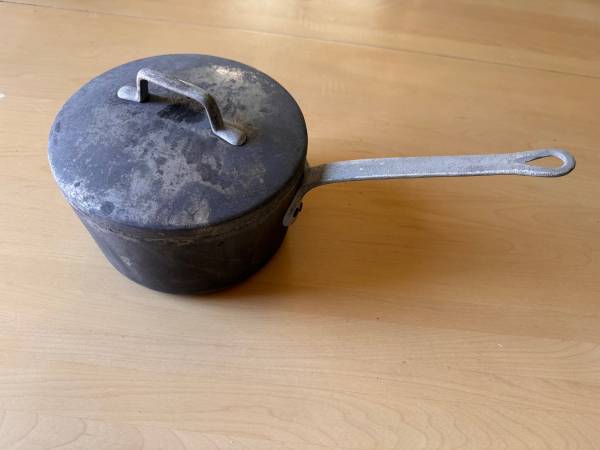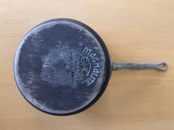 Vintage heavy Magnalite GHC anodized aluminum 2 qt saucepan and lid. The round pan's diameter is approximately 6-1/2 inches. The pan lays flat on a flat surface. This pan is in Good pre-owned condition and shows some marks and discoloration from normal use. Please look at all of the pictures for more details and message me with any questions.