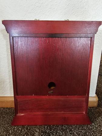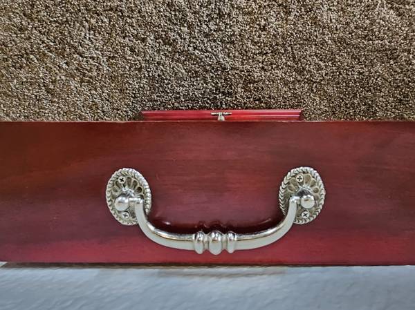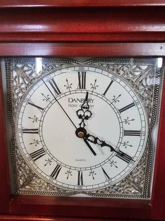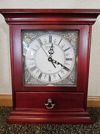 Danbury Clock, Cherry Wood, Battery, with Drawer 13.25" Tall, 10.75" Wide, 3.5" Deep Silver metal colored hardware and inlay design Works great, keeps perfect time