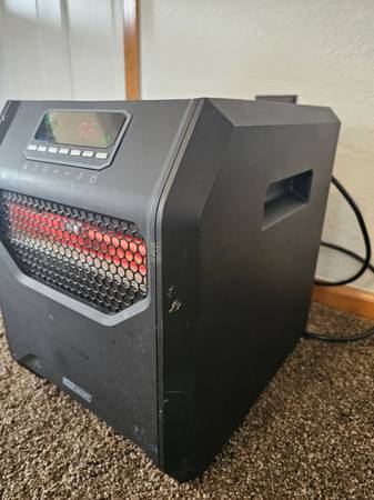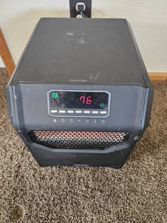 Works great, some scratches, one broken piece of plastic on back right-does not affect performance of heater, overheat and tip over safety shut-off, 15Amp, 110V