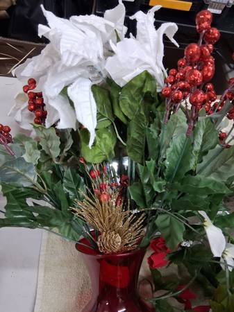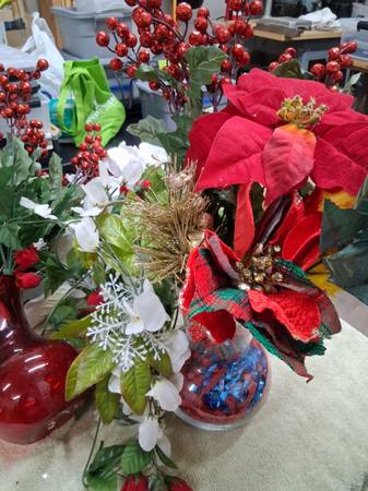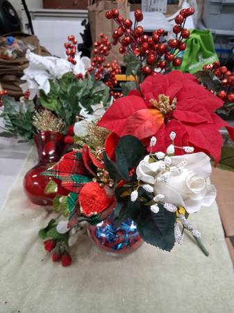 Artificial Flowers And 2 Vases - 1 Glass And 1 Plastic