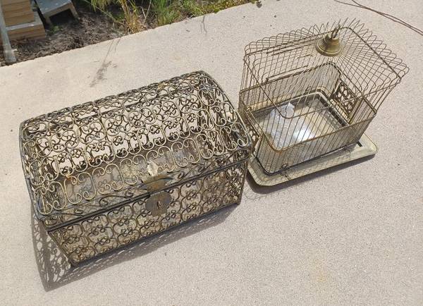 Old brass bird cage (sold) and ornate wire chest $20 ea or best offer and bird feeders $5 ea