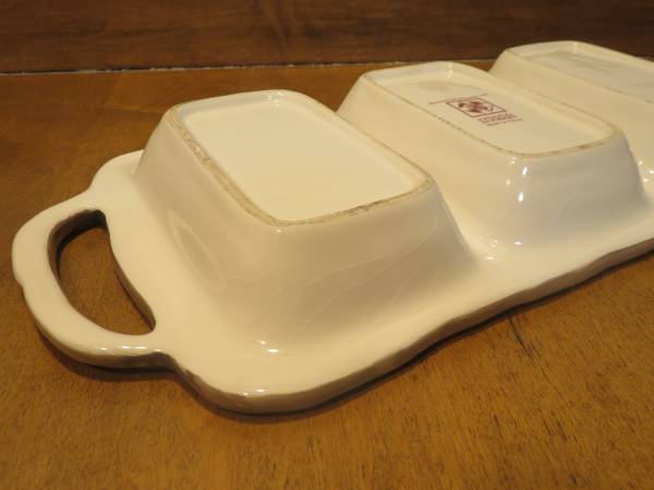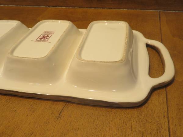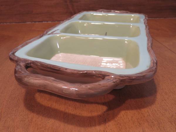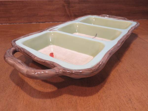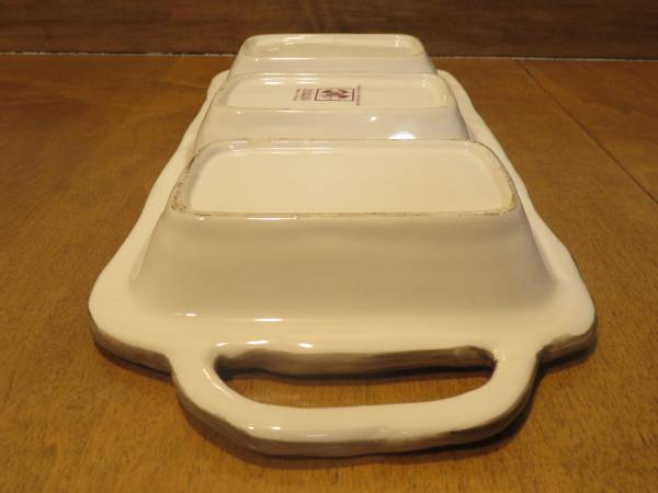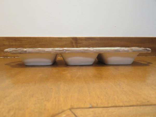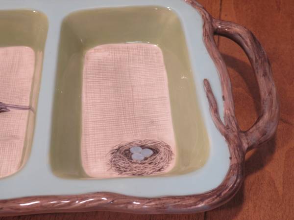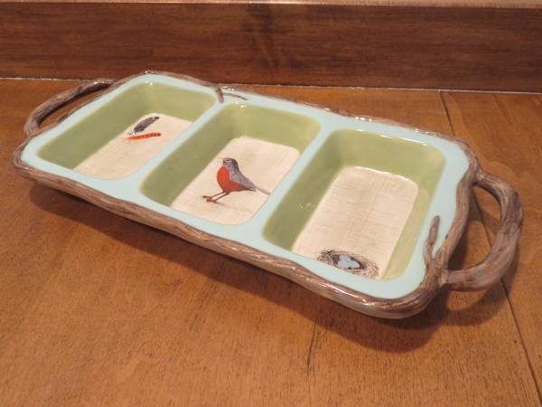 This listing is for one serving tray featuring a bird motif made by MWW Market. This serving tray appears to be glazed ceramic. There are 3 compartments each measuring about 3.5 inches wide, 5.5 inches long, and 1.25 inches deep. The compartments have bird feathers, a bird (robin), and a nest that are painted. The rim and handles are made to look like tree branches. Overall tray dimensions are approximately 15.5 inches wide (including the handles), 7 inches long, and 1.75 inches high. This serving tray is used but in very good condition. There are no major chips or cracks on the surface but there are a couple chips on the bottom footers of the tray compartments. The bottom of the right compartment has some wear and you can feel a slight erosion of the ceramic. The bottom of the left compartment has two small chips in the ceramic. The bottom footers also have some general wear from being used and stored. This serving tray is microwave and dishwasher safe. Please review all posted pictures. Pictures are of the actual item you will receive. Item comes from a smoke-free home. Feel free to ask me any questions.