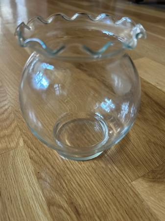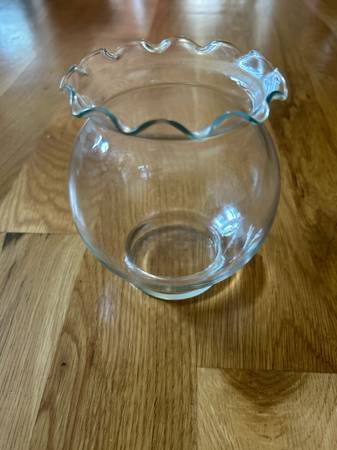 Fluted top edge glass small round vase. 5.5” tall by 4.5” at widest and 2.75” top opening.