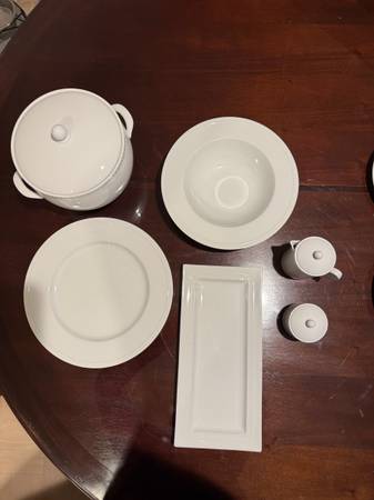 ***FOR SALE: FULL SET OF CRATE AND BARREL STACCATO DINNERWARE AND MULTIPLE SIDE PIECES*** BEAUTIFUL SET THAT IS DISHWASHER, MICROWAVE, AND OVEN SAFE! WHITE DISHES WITH SMALL WHITE DOTS AROUND THE...