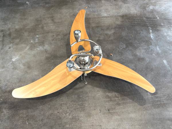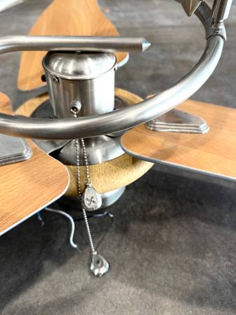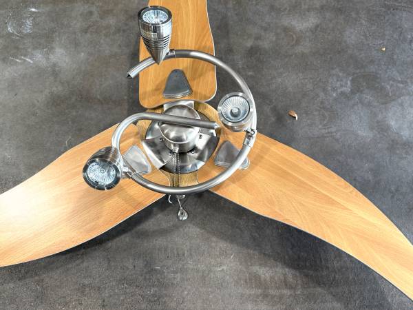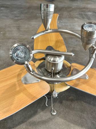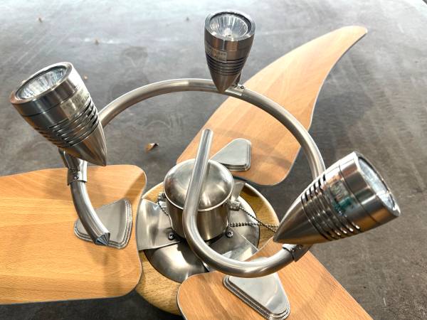 Brushed nickel ceiling fan finish, 3 beech finish blades, adjustable spot lights