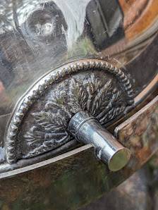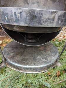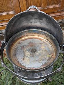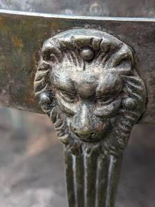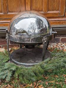 Large vintage Regency silver plated round silver chafing dish chafer with lions. Item includes lion heads, paw feet, cabriole legs, lower burner, rolling lid, very nice antique item, circa early 20th century.