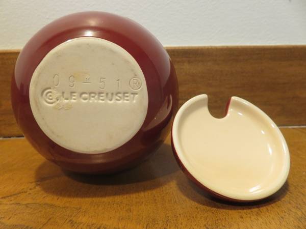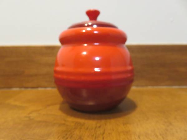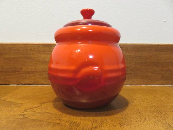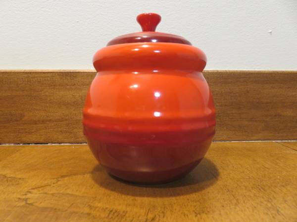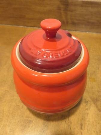 This listing is for one BBQ pot and lid by Le Creuset. This BBQ pot is “cerise red” and has a “piggy pig” logo on the side. Note that this listing includes only the pot and lid. The pot measures approximately 4 inches wide and 5 inches high (including the lid). The pot has a capacity of 15 oz. This BBQ pot is lightly used and in great condition. There are no major chips or cracks. There is some minor wear on the bottom from being on the shelf and used over the years. Please review all posted pictures. Pictures are of the actual item you will receive. Item comes from a smoke-free home. Feel free to ask me any questions.