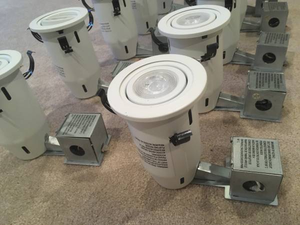 LED Recessed lighting trim kit lights 3 inch hole (4 in trim) 12 total x $5 each LED light bulbs Ecosmart (350 lumens)