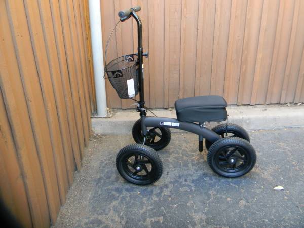 Lightly used all terrain knee scooter. Used for one month after having foot surgery. I am a 220 lb man and had no issues with this scooter. The scooter is in near new condition. I had no problems getting around the house or in and out of appointments or stores for errands. It has a full brake on it and collapses down for easy transportation. Tires are filled with air and it is ready for use. Paid 286.00 with taxes and am looking for 150.00 dollars. This scooter is for someone that doesn’t want to crash on a crack in the concrete or parking lot. It was designed for stability and it functions as intended. It is a great scooter!