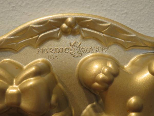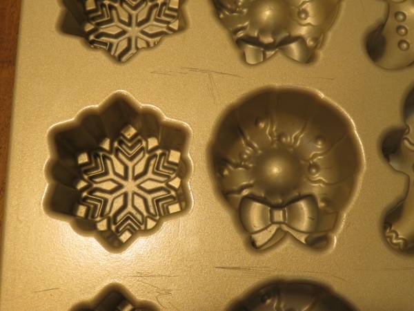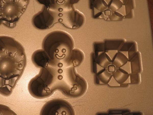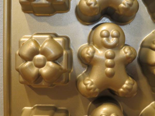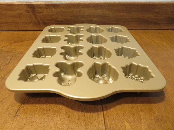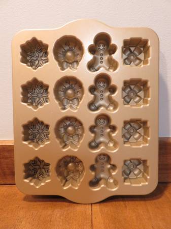 This listing is for one holiday pan from Nordic Ware. The pan is 12 inches in length, 9.5 inches wide, and 1.25 inches deep. This cast-aluminum pan has 16 compartments for wreaths, snowflakes, presents, and gingerbread people. This pan is sold at Williams Sonoma. Here is the description from their web site: