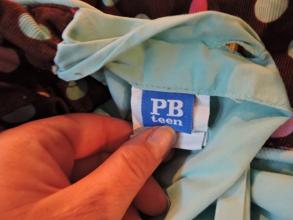 Pottery Barn Teen Polka Dot Brown Corduroy Duvet for Full / Double Queen Bed. $40 cash only. Pre-owned. A small ink stain on the back. Please refer to photos. Dark brown corduroy with multi-colored (pink, light blue & yellow) polka dots and opposite side is light teal. Can be used on either side. Used on a full bed. Tag states "full-queen" size bed. Measure 79"W x 80.5"L. Closes at the bottom with 8 buttons. 100% cotton. Made in China. Machine wash warm, gentle cycle, only non-chlorine bleach when needed, tumble dry low remove promptly, warm iron as needed.
