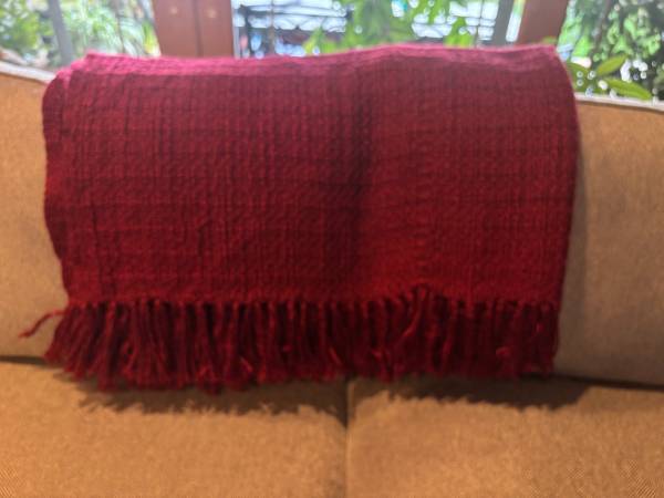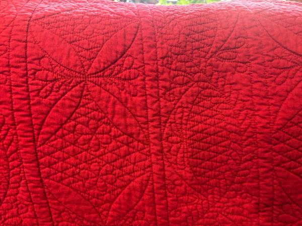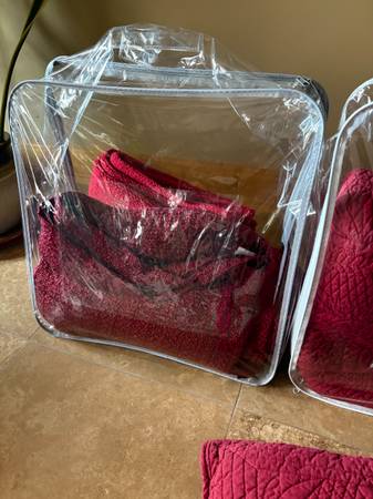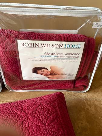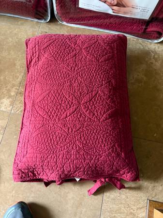 Quilt and decorative pillow, from Pottery Barn, gently used. Includes 2 red throw blankets.