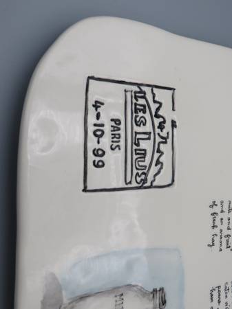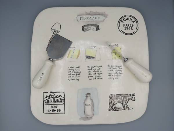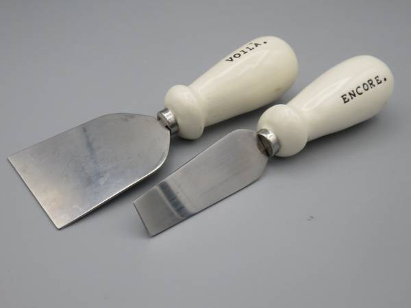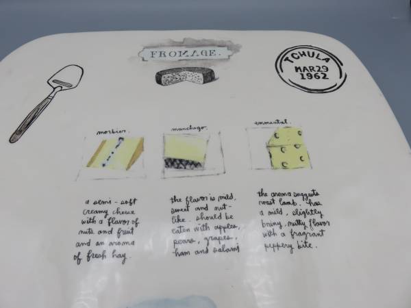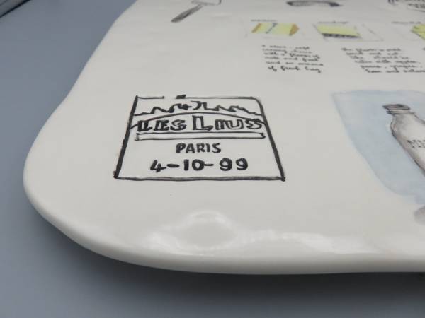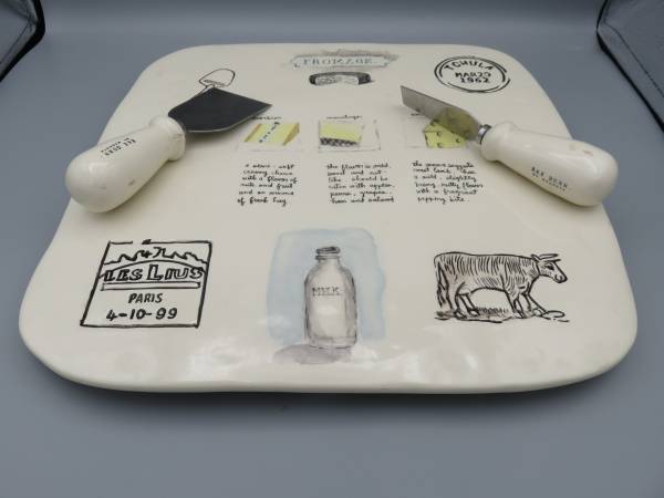This listing is for a cheese platter and 2 cheese knives. These are made by “Rae Dunn by Magenta”. Featuring a French motif. We got this as a gift many years ago and I think there used to be 2 other knives but they have been lost over the years. The platter has various dimples and imperfections due to the creation process. The images and words remain clear and there is very little color fading. The platter is about 12 inches wide and 12 inches long and 0.9 inches tall. The knives are about 5.5 inches long. One knife says “ VOILA.” and the other one says “ENCORE.”. This item is used but in very good condition. There are no chips or cracks on the platter. There are some minor scuffing on the bottom of the platter from usage. Each cheese knife has a chip and some scuffing on the handle. Please review all posted pictures. Pictures are of the actual item you will receive. Item comes from a smoke-free home. Feel free to ask me any questions.