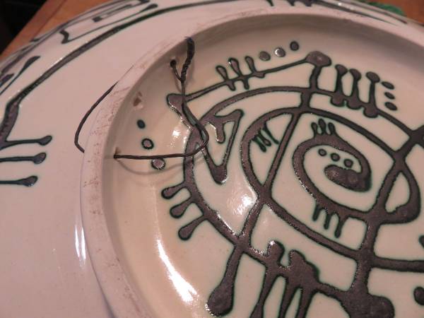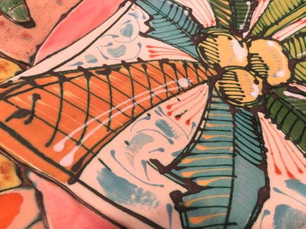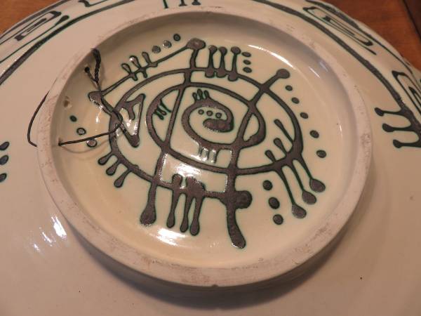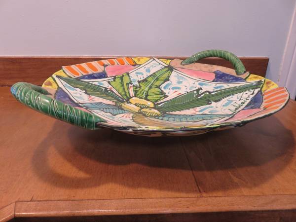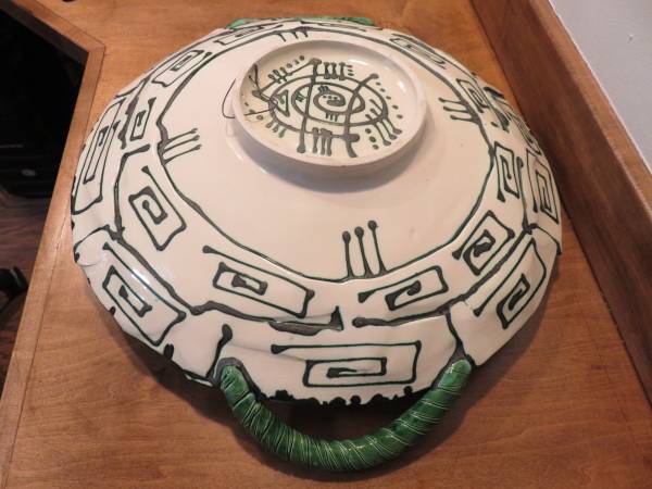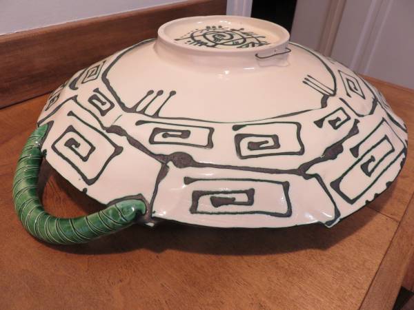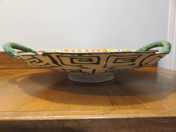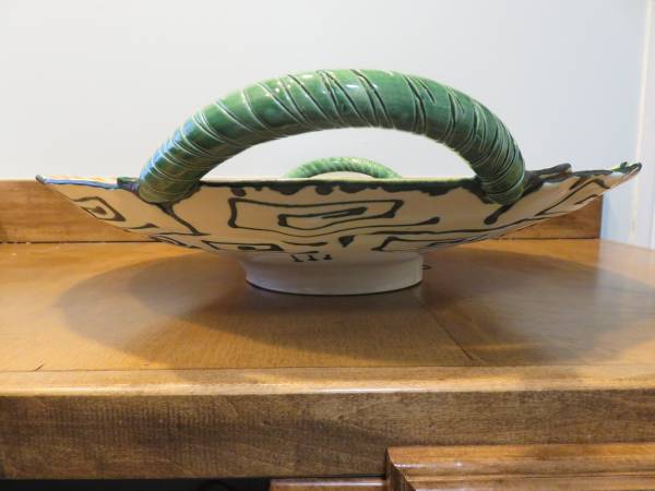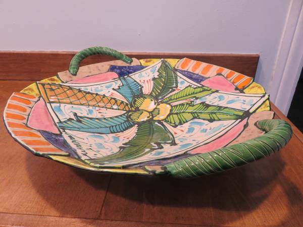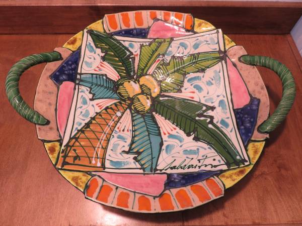 This platter is from Florida artist Rasa Saldaitis. This beautiful platter is hand painted and glazed and signed by the artist. There is a loop on the back so it can be hung on a wall. The platter has a foot and 2 handles. The platter is about 17.75 inches in diameter and 3.5 inches tall (not including the added handle height). With the handles, the total width is about 21 inches and the height is about 5 inches. This platter is used but in excellent condition. There are no major chips, cracks, stains, or flaws but there is some very minor wear on the bottom from usage and storage. There are various other imperfections from being hand-made. Please review all posted pictures. Pictures are of the actual item you will receive. Item comes from a smoke-free home. Feel free to ask me any questions.
