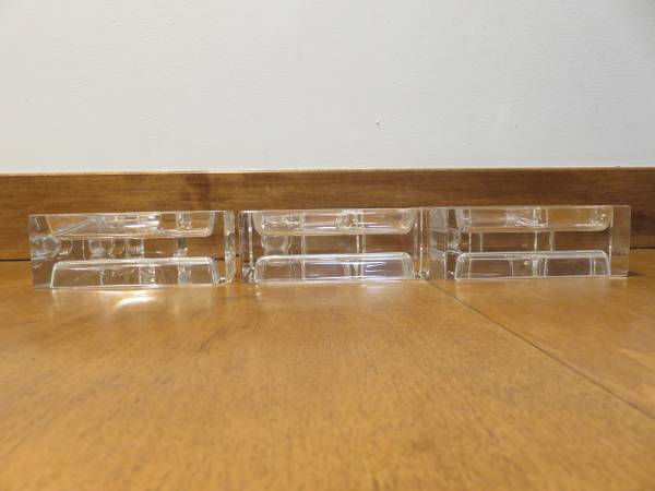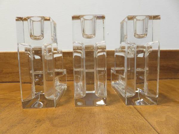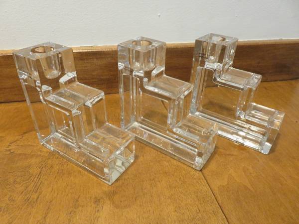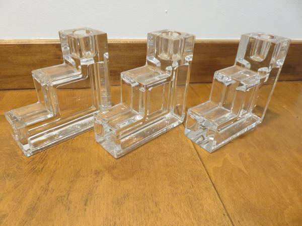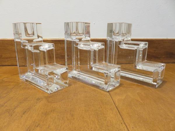 This listing is for one set of 3 glass candle holders from the Metropolitan Museum of Art (MMA) store. These are based on the original design from Wilber Orme. The design was from 1938 and was called “Pristine Table Architecture”. This is some background on the original design from the MMA site: “The set's building-block design is drawn from the step-back, or gradually narrowing, of the uppermost sections of skyscrapers required by law (passed in 1916) to provide for sunlight at street level. The clear geometry and regular proportions of the zigzag contours are characteristics of Art Deco. The individual pieces can be arranged creatively into different configurations.”