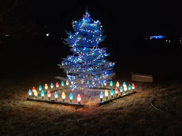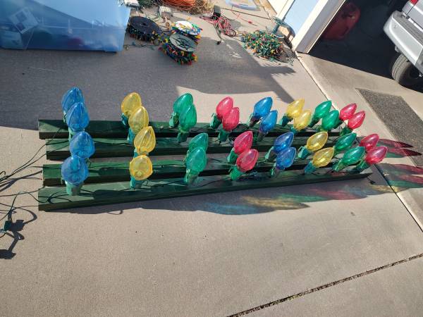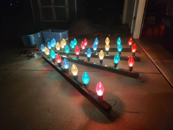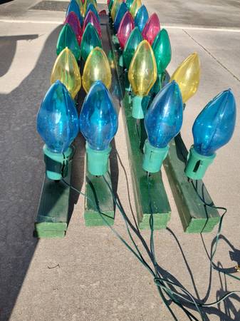 Jumbo Christmas lights, 4 sets of 8 (32 total) with home-made stands, 4 each, 8 feet long. They use C9 bulbs and are in good condition (approximately 15 years old). Can be set up along a path or around a Christmas tree (path or tree not included). $100 cash only please.