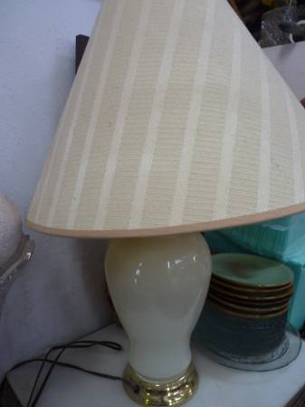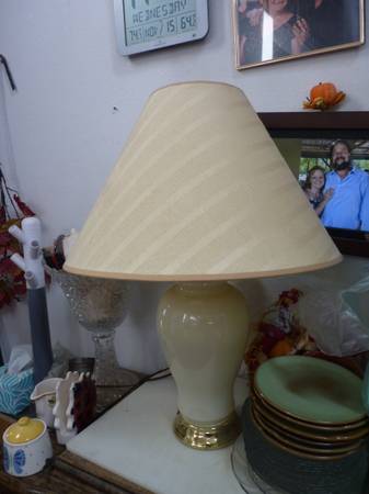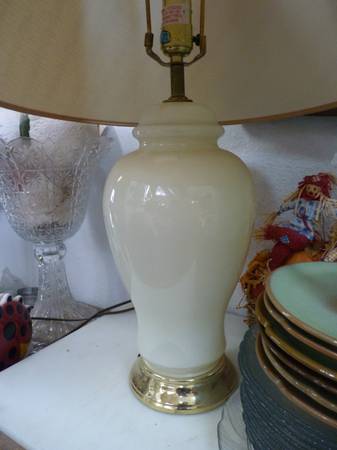 Nice jar lamp with shade The body of the lamp is glass Color is ivory in the sunlight and white in the dark of day The lamp is 21 1/2 inches tall The shade has a texture and the design goes around...