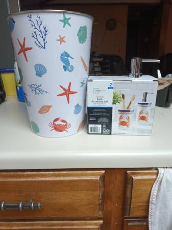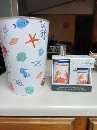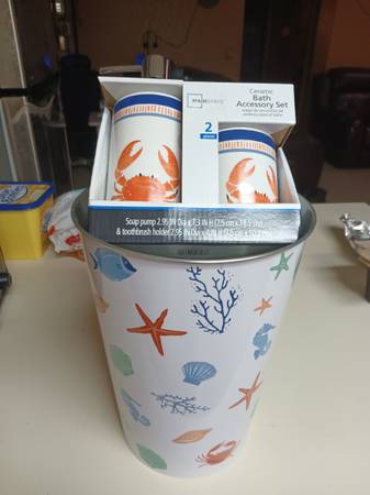 I have a brand new bathroom set. Trash can and cup set, ceramic still in the package. I'm located in fort Lupton willing to meet close by.