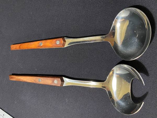 Hi, I have Vintage Fraser’s WHF Cromargan Salad Server Spoons With Original Box MCM Spoon & Fork Set for sale. They are still in excellent shape. They have been very lightly used. They have an awesome Mid Century Modern look. I do have the original box for storage. They can be shipped with USPS or picked up locally. Please see pictures. Please keep in mind that this is a cat friendly home. Please get a hold of me if you have any questions.