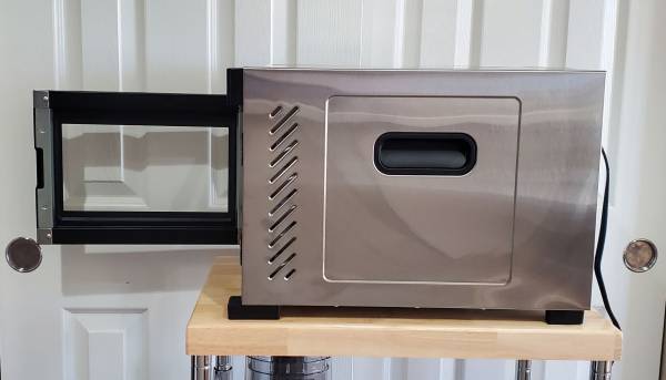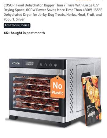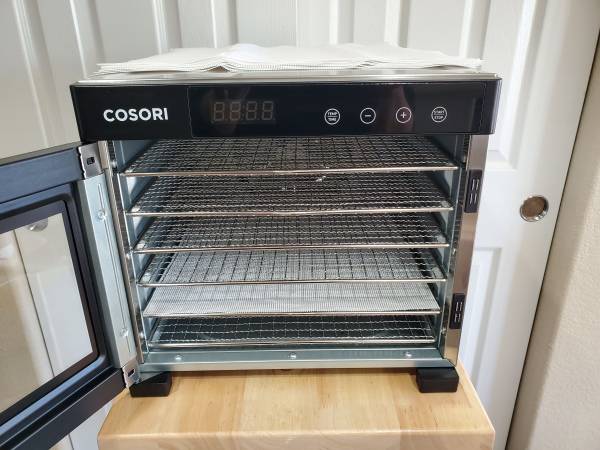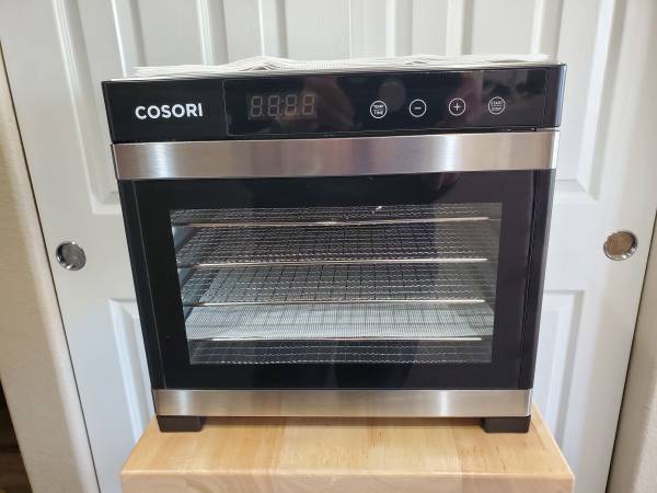 COSORI food dehydrator, used 4 times, in like-new condition, perfect working order. Includes Complete Dehydrator Cookbook and Kispog silicone dehydrator sheets. No plastic, food grade stainless steel. Quiet 600 watt motor, has timer that can be set for 48 hours. Has digital control panel.