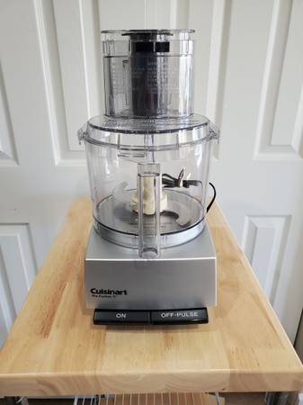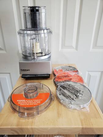 Cuisinart 11 cup brushed chrome food processor, never used, in perfect working condition. Includes chopping mixing blade, 2mm shredding disc, 4mm slicing disc, disc stem.