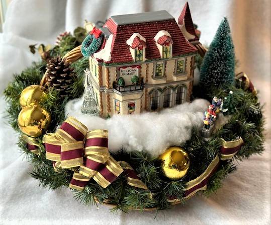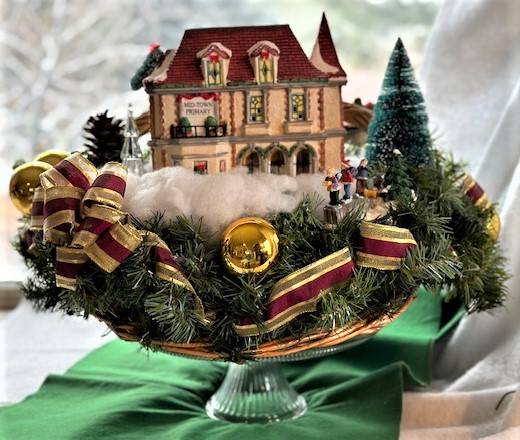 Handcrafted Wicker Basket Christmas Decoration/Centerpiece with Victorian Schoolhouse and Gazebo surrounded with artificial pine sprigs, pine cones, fleece snow, and large gold glass Christmas balls. Interspersed with small Victorian figurines, trees, bears and other creatures, all wrapped with wide red and gold ribbon tied in a bow and small white holiday lights. Victorian Schoolhouse and light strand light up. Cords go from the back of the basket, or can be tucked in of you don't want the centerpiece to light up. One picture shows the basket displayed atop a crystal pedestal cake plate (NOT included).