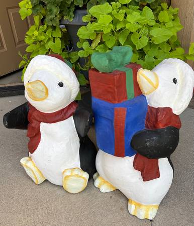 Christmas Holiday Décor Large Penguin figures bearing gifts and outfitted for outdoor activities Light material (some sort of molded mache) Each penguin stands 22" tall Bottom diameter is about 11"...