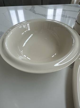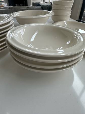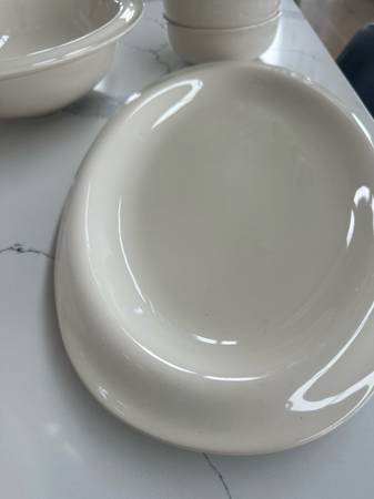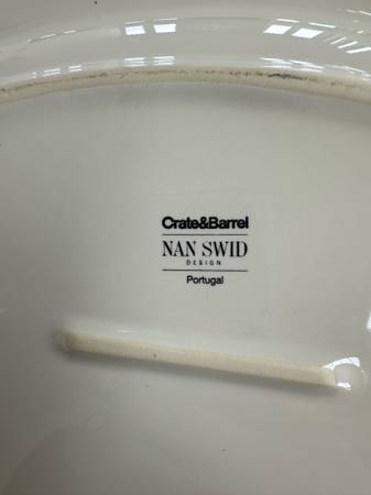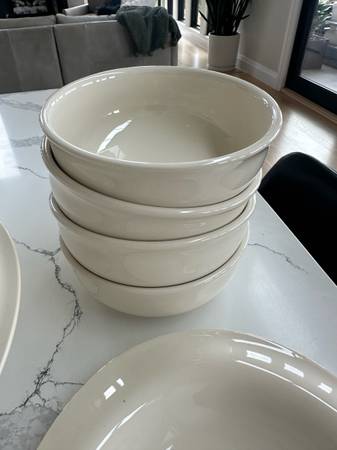 Crate and Barrel. Includes 8 plates, 4 of each type of bowl, and 2 serving platters. No chips.